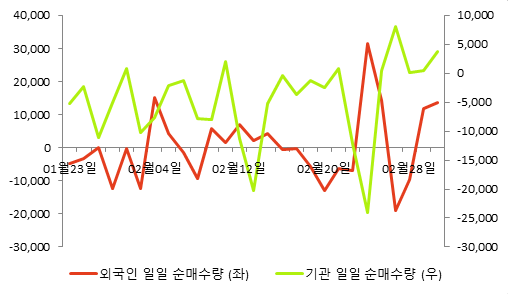 다음 표는 동종목의 외국인, 기관의 일별 순매수량을 나타낸 것이다.