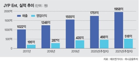 올해 실적도 상승세를 이어갈 전망이다. 금융정보업체 에프앤가이드에 따르면 증권업계는 JYP Ent.의 올해 영업이익이 지난해보다 7.12% 증가한 466억원으로 추정하고 있다.