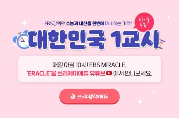 지식공유 플랫폼 주식회사 디쉐어의 수능 영어 및 내신 전문 브랜드 쓰리제이에듀는 2주간 수능 특강 '이라클' 강좌를 무료로 들을 수 있는 '대한민국 1교시'를 진행한다고 9일 밝혔다.