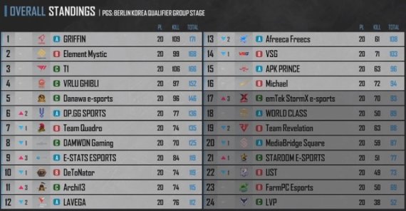 9일 펍지에 따르면, 그룹 스테이지 2주 차 경기에서 그리핀(GRIFFIN)이 누적 109킬 171포인트로 1위에 올랐다.이어 엘리먼트 미스틱(ElementMystic), 티원(T1), 브이알루 기블리(VRLU GHIBLI), 다나와 이스포츠(Danawa e-sports)가 2~5위를 차지했다.