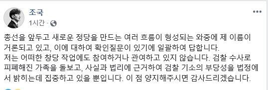 조 전 장관은 "어떠한 창당 작업에도 참여하거나 관여하고 있지 않다"고 밝혔다"며 "검찰 수사로 피폐해진 가족을 돌보고, 사실과 법리에 근거하여 검찰 기소의 부당성을 법정에서 밝히는 데 집중하고 있을 뿐"이라고 강조했다.