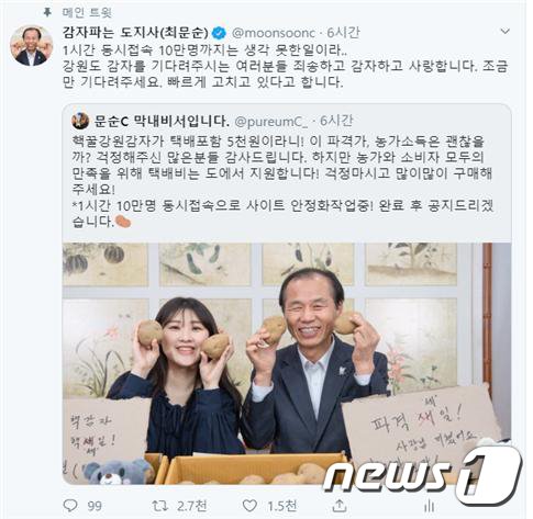(춘천=뉴스1) 하중천 기자 = 최문순 강원도지사가 개인 트위터를 활용해 코로나19(신종 코로나바이러스 감염증) 사태로 감자 출하에 어려움을 겪고 있는 농가들을 돕고 있어 화제다.