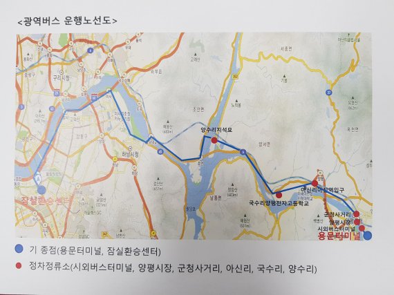 [양평=파이낸셜뉴스 강근주 기자] 양평군 용문터미널에서 잠실을 오가는 광역버스 G9311이 오는 20일부터 첫 운행을 시작한다.