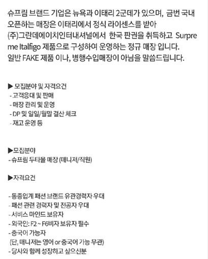 이번 채용 공고에도 "슈프림 브랜드 기업은 뉴욕과 이탈리아 2곳이 있다"며 "금번 국내에 오픈하는 매장을 이탈리아에서 정식 라이센스를 받아 그란데에이치인터내셔널에서 한국 판권을 취득하고 '슈프림 이탈피고'(Supreme Italfigo) 제품으로 구성해 운영하는 정규 매장"이라는 내용이 포함돼 있다.