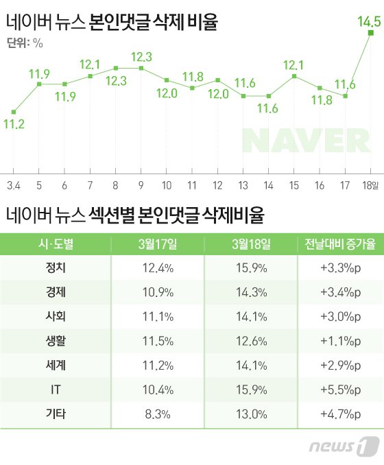 19일 네이버 데이터랩에 따르면 지난 18일 본인이 직접 삭제한 댓글 수는 8만1217개다. 전체 댓글수인 55만9570개에서 14.5%의 비율에 해당한다.