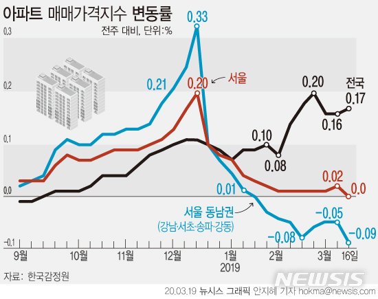 19일 한국감정원이 발표한 '2020년 3월 3주 주간아파트 가격동향'에 따르면, 지난 16일 기준 서울 아파트 매매가격은 보합세를 나타냈다.