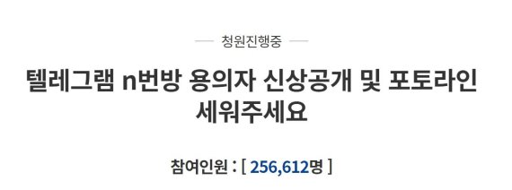 20일 청와대 국민청원 홈페이지에 따르면, 지난 18일 올라온 '텔레그램 n번방 용의자 신상공개 및 포토라인 세워주세요'라는 제목의 청원에 이날 오전 11시 현재 25만6612명이 참여했다.