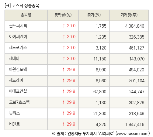 [fnRASSI]장마감, 코스닥 상승 종목(골드퍼시픽 30.0% ↑)