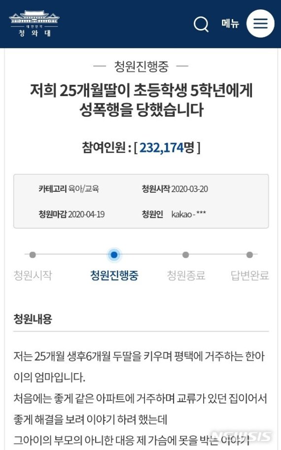 21일 청와대 홈페이지에 따르면 20일 국민청원 게시판에 "저희 25개월 딸이 초등학생 5학년에게 성폭행을 당했습니다"라는 글이 올라왔다.