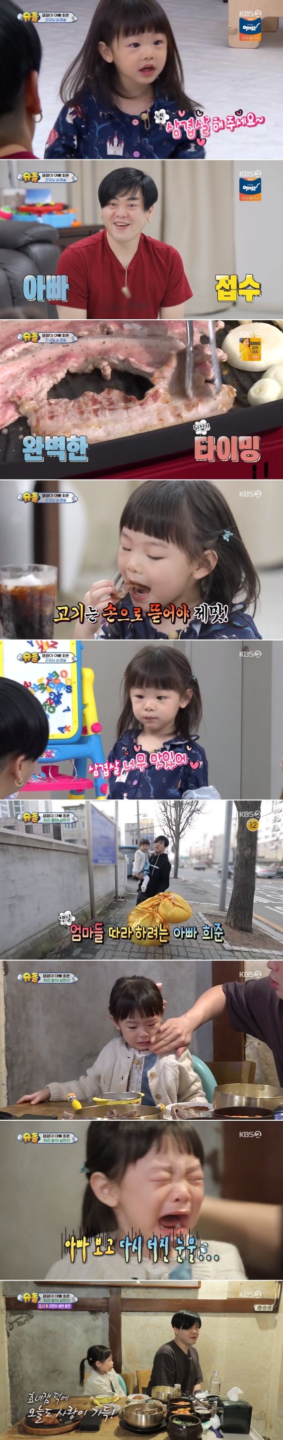 무사히 세탁을 끝낸 부녀는 빈대떡과 방치탕을 먹으러 향했다. 잼잼이는 아빠가 잠시 나간 사이 '방치탕을 허리로 만들었다'는 식당 아주머니의 말에 통곡을 하기 시작했다. 잼잼이는 아빠 허리로 만들었다고 생각한 것. 이에 놀란 문희준은 "아빠 허리 괜찮다"라며 숭구리 당당 춤을 선보였고 그제야 잼잼이는 안심하며 웃었다.
