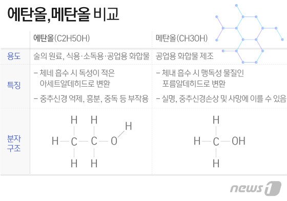 (서울=뉴스1) 성재준 바이오전문기자,김혜지 기자 = 메틸알코올(메탄올)을 이용한 소독제로 소독을 실시할 경우 인체에 치명적인 손상이 발생할 수 있어 주의가 필요하다. 메탄올이 체내에 흡수될 경우 맹독 물질을 만들어 신경손상뿐 아니라 사망에 이를 수 있기 때문이다. 보건 당국이 사용을 권장하는 알코올 소독제는 에틸알코올(에탄올)로 만든 소독제다.