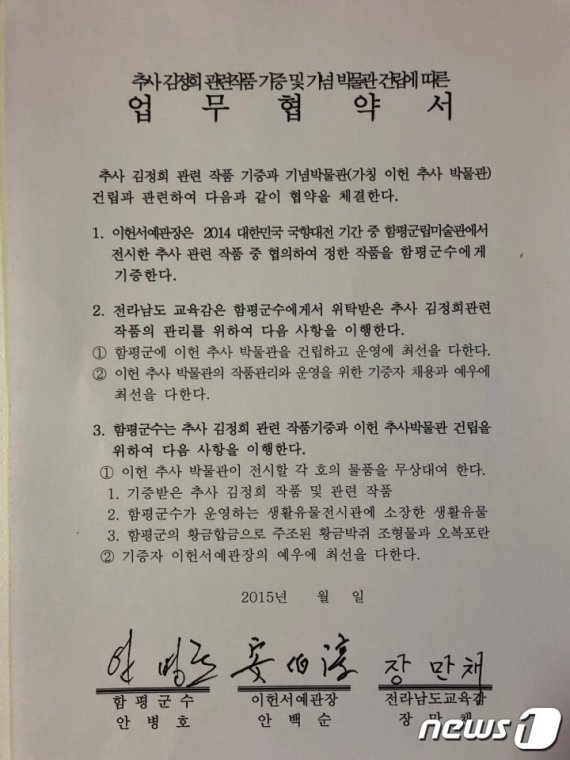 앞서 군은 관광과 학습의 장으로 활용한다는 계획으로 지난 2015년 '추사 김정희 박물관' 건립을 계획한 후 A씨로부터 작품 50점을 기증받고 30점을 35억원에 매입했다.