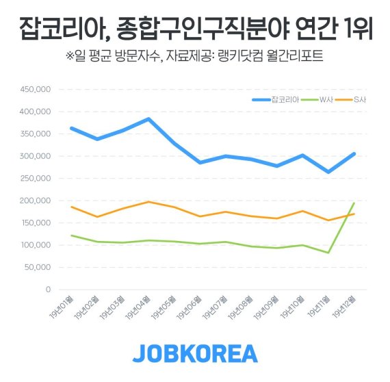 한편 잡코리아는 2020년 들어 3월 둘째주까지 10주 연속 종합구인구직 분야 1위를 기록하고 있다. 랭키닷컴 주간 리포트에 의하면 2020년 들어 현재까지 잡코리아의 일 평균 방문자수는 33만6천여명, 국내 전체 사이트 중 평균 순위는 26위에 랭크되고 있다.