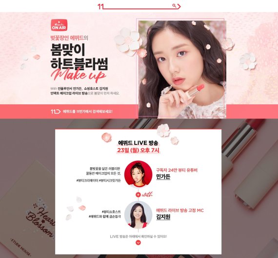 에뛰드와 함께 한 라이브 방송에는 구독자 24만4999명을 보유한 인기 뷰티유튜버 '민가든', 쇼핑호스트 '김지원'이 출연했다. 에뛰드가 최근 출시한 벚꽃컬렉션 '하트블라썸'으로 연출할 수 있는 화사한 봄맞이 메이크업 팁을 알려줬다.