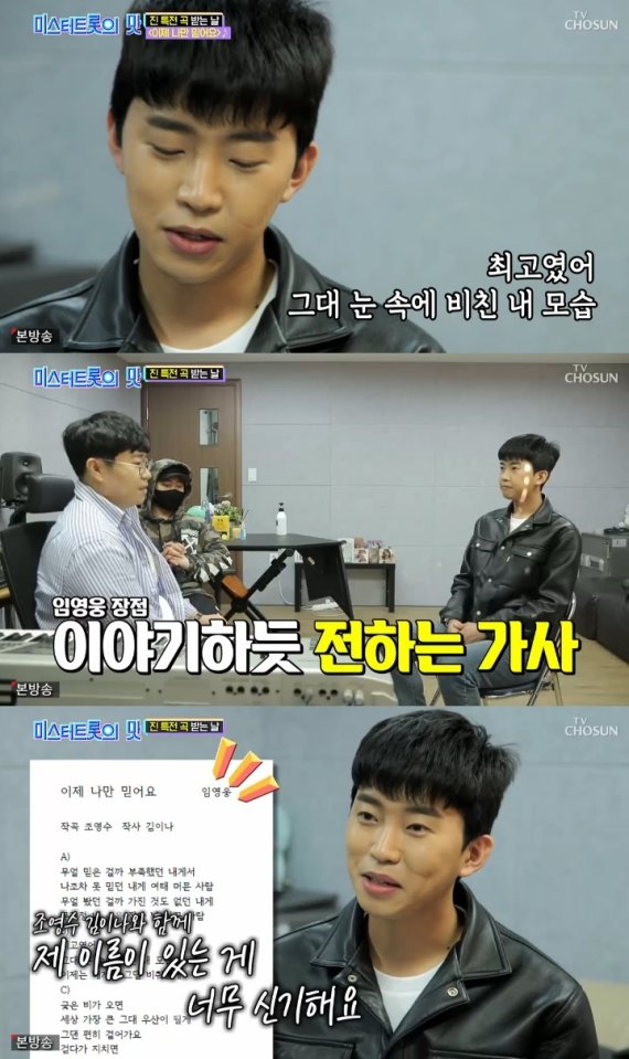 임영웅은 감격했다. 그는 가사가 적힌 종이를 들고 "여기 조영수, 김이나와 함께 제 이름이 있다는 게 너무 신기하다"며 눈을 떼지 못했다. 이어 "진짜 이런 특별한 순간들이 항상 남일이라고만 생각했는데"라며 "제가 생각한 가사가 적혀 있다. 열심히 연습해 보겠다"고 다짐했다.