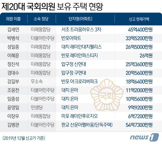 최근 정부가 발표한 '2020년 공동주택 공시가격'에서 공시가 인상률이 높았던 아리팍·래대팰·마래푸(아크로리버파크·래미안대치팰리스·마포래미안푸르지오) 등을 보유한 의원들도 눈에 띈다.