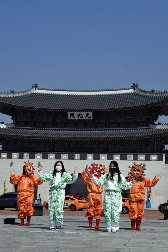 30일 오전 서울 세종대로 광화문광장에서 환경보건시민센터 회원들이 신종 코로나바이러스 감염증(코로나19) 확산 방지를 위한 노래와 율동을 선보이고 있다. 사진=서동일 기자