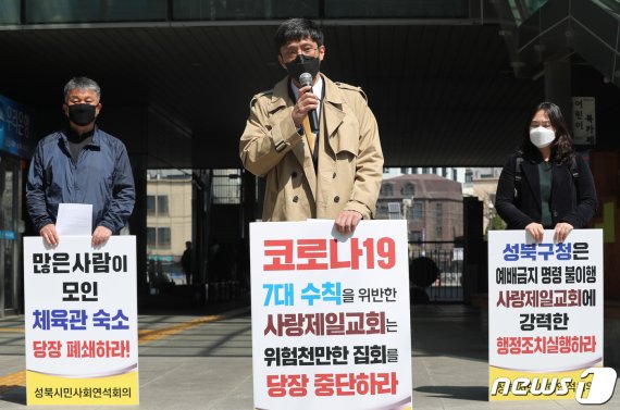 성북시민사회연석회의(연석회의)는 30일 오후 1시쯤 성북구청 앞에서 기자회견을 열고 "사랑제일교회에 무증상 확진자나 확진자가 예배에 참석하고 예배에 참석한 사람들이 감염돼서 신종 코로나바이러스 감염증(코로나19)이 지역사회로 전파될 수 있다"며 "서울시장과 성북구청장은 예배집회 금지 행정명령을 묵살하고 있는 사랑제일교회의 예배 집회를 확실하게 금지하라"고 촉구했다.