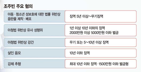현재 조주빈은 △아동·청소년의 성보호에 관한 법률 위반(음란물 제작·배포 등) △아청법 위반(유사성행위) △아청법 위반(강간) △강제추행 △성폭력범죄의 처벌 등에 관한 특례법 위반(카메라 등 이용 촬영) △아동복지법 위반(아동에 대한 음행강요·매개·성희롱 등) △강요 △강요미수 △협박 △개인정보보호법 위반 △살인음모 △사기 등 12개 혐의를 받고 있다.