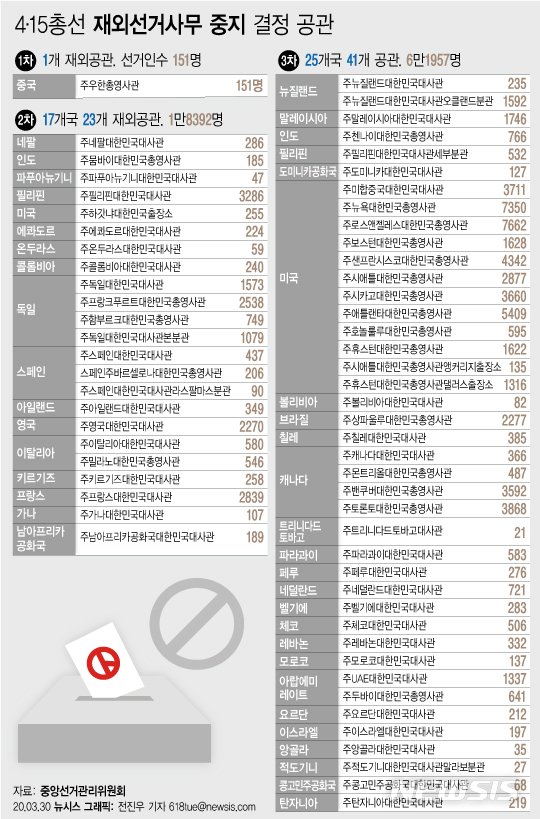 코로나19 사태로 투표 사무가 차질을 빚지 않도록 직무 대행자 사전 지정, 예비 인력 확보 등 방역지침도 공관에 전달한 상태다.