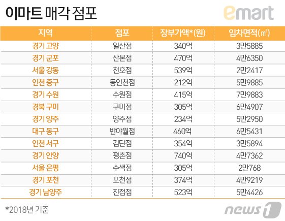 2일 이마트의 지난해 사업보고서에 따르면 이마트가 매각한 점포는 Δ일산점 Δ산본점 Δ천호점 Δ동인천점 Δ수원점 Δ구미점 Δ양주점 Δ반야월점 Δ검단점 Δ평촌점 Δ수색점 Δ포천점 Δ진접점이다. 구미와 반야월점을 제외하면 11곳이 수도권인 셈이다.