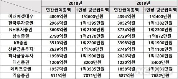 대신증권과 키움증권의 경우 자기자본 10위권안에 포함된 증권사지만 직원 1인당 평균 연봉은 1억원이 채 되지 않는 것으로 집계됐다.