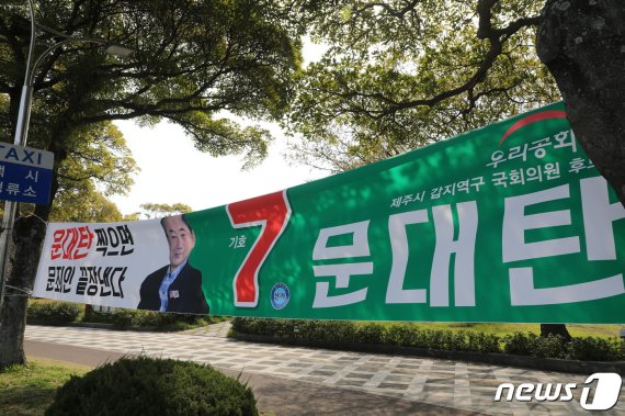 '제주시 갑'에 출마한 우리공화당 문대탄 후보측은 이날 '문대탄 찍으면 문죄인 끝장낸다'는 문구를 넣은 선거 현수막을 거리에 걸었다.