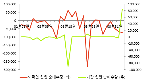 다음 표는 동종목의 외국인, 기관의 일별 순매수량을 나타낸 것이다.