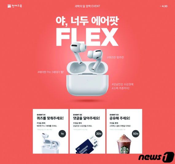 우선 퀴즈 이벤트를 통해 무선 이어폰 관련 과학원리에 관한 퀴즈를 맞춘 정답자 1명을 추첨해 '에어팟프로'를 증정한다.