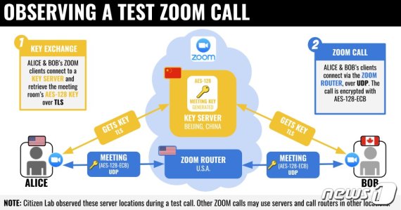 시티즌랩은 "테스트 결과 줌의 암호키가 중국 현지 데이터센터에 있는 키 서버를 경유했다"며 "줌은 중국 당국은 암호키를 제공할 법적 의무가 있기 때문에 사용자의 데이터에 중국 정부가 접근할 수 있다"고 지적했다.