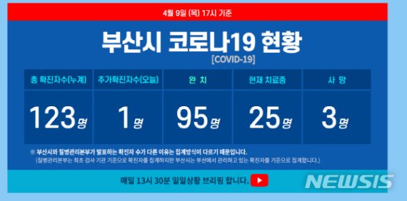 [부산=뉴시스] 제갈수만 기자 = 부산시는 10일 오전 10시 기준 코로나19 확진자는 전날 오후 5시 대비 추가 확진자 없이 123명을 유지하고 있다고 밝혔다.