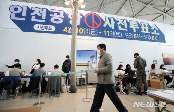 코로나19 여파로 인천공항의 여객수가 예년에 비해 90% 넘게 감소하면서 이곳에서의 사전투표율은 역대 최저를 기록할 가능성이 높다는 관측이 많다.