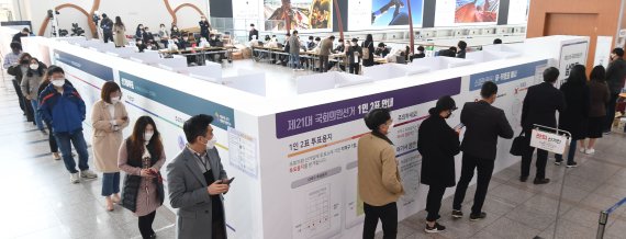 제21대 국회의원선거 사전투표 첫날인 10일 오전 서울역에 마련된 남영동 사전투표소에서 시민들이 코로나19 예방을 위해 '사회적 거리를 유지'하고 투표하고 있다. 사진=박범준 기자