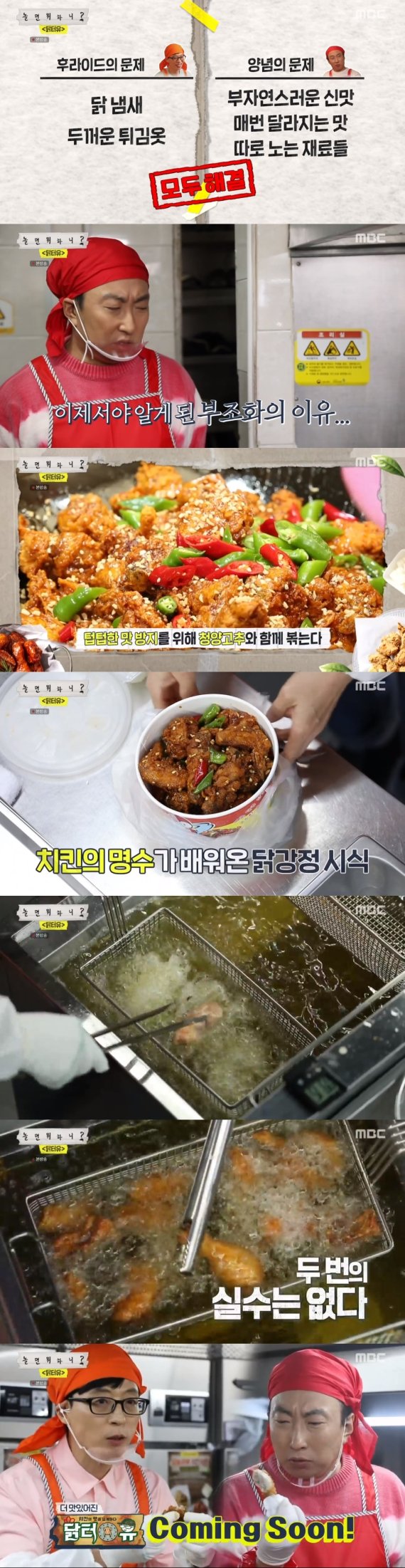 지난주에 이어 유재석과 박명수가 치킨 조리에 도전하는 모습이 그려졌다. 유재석은 닭을 물 반죽에 담갔다가 튀김 가루를 다시 묻혀야 했지만, 물 반죽 제작을 깜빡 잊고 말았다. 다시 레시피대로 조리를 시작한 유재석. 박명수는 "빨리 빨리 해야 한다" "털어. 뭉치게 하면 안 된다"고 잔소리를 했다.