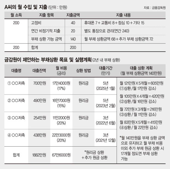 무엇보다 월 현금흐름을 방해하는 요소인 신용카드를 없애고, 할부와 카드론을 포함해 카드값을 선결제(350만원)한 후 고금리대출(24%, 330만원)부터 상환할 것을 주문했다. 금감원은 A씨 월급 200만원에서 변동비와 비정기적 지출을 제외한 나머지 금액인 140만원을 부채상환 금액으로 유지할 것을 조언했다.
