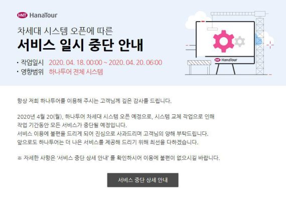 하나투어는 이메일 발송 및 각 시스템 게시판 등을 통해 서비스 일시 중단을 안내하며, 서비스 이용에 불편을 드린 점에 대한 양해를 구하고 더 나은 서비스를 제공하기 위해 최선을 다하겠다고 설명했다.