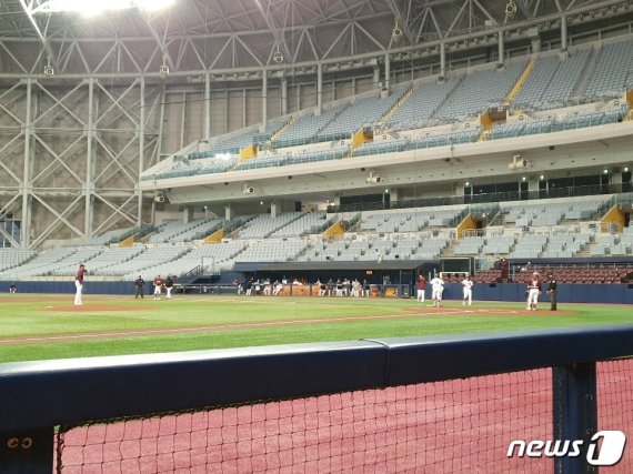 (고척=뉴스1) 나연준 기자 = 키움 히어로즈의 청백전이 진행된 13일 서울 고척 스카이돔. 경기 중에 음악이 울려 퍼졌다. 프로야구 개막에 대비해 실전과 비슷한 환경을 만들기 위한 노력의 일환이었다.