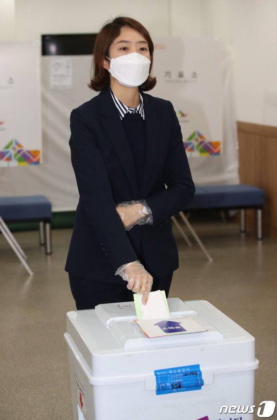 (서울=뉴스1) 조임성 기자,김정근 기자 = 4.15총선에서 서울 광진을에 출마한 고민정 더불어민주당 후보가 15일 이른 아침 서울 광진구 투표소를 찾아 투표를 마쳤다.