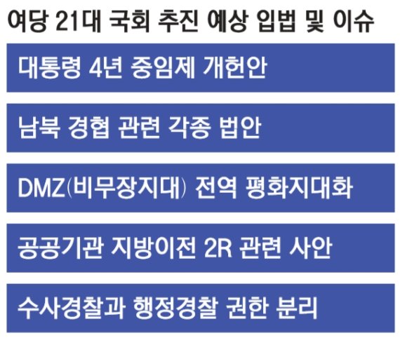여기에 그동안 여권의 각종 숙원사업 추진도 조만간 탄력이 붙을 것이라는 전망이 나온다. 코로나 사태가 어느 정도 진정되고 21대 국회가 출범하면 청와대나 여권이 남북경협이나 개헌 등도 재시동을 걸 것으로 보인다. 두 이슈 모두 현 정부의 숙원사업으로 그동안은 대내외 여건이 좋지 않아 성과를 내지 못했다.