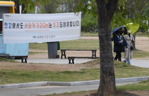 정부가 20일부터 내달 5일까지 현재의 '사회적 거리두기' 근간을 유지하며 일부 제한을 완화하겠다고 발표한 19일 서울 여의도 한강시민공원에서 우산을 쓴 시민들이 산책을 하고 있다. 사진=