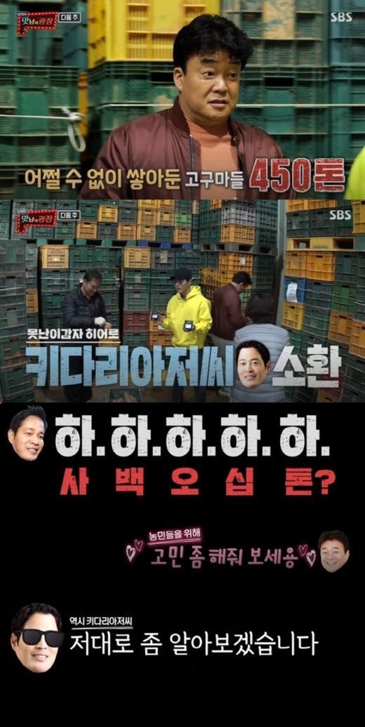 지난 22일 공개된 SBS TV 예능프로그램 '맛남의 광장' 예고편에는 백종원 더본코리아 대표가 정 부회장에게 "상품성이 떨어지는 전남 해남 왕고구마 450톤(t)을 구매해달라"고 부탁하는 장면이 나왔다. 정 부회장은 450톤 물량이라는 얘기에 당황한 듯 "알아보겠다"고 말했다. 이 예고편에는 정 부회장이 백 대표 요구를 받아들였는지 나오진 않았지만, 출연진 '450톤의 기적'이라며 깜짝 놀라는 장면이 나온다.