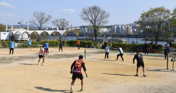 종전보다 완화된 형태의 '사회적 거리두기'가 시행된 뒤 첫 주말인 26일 서울 용산구 이촌한강공원에서 시민들이 화창한 날씨속에 족구를 하며 휴일을 즐기고 있다. 사진=