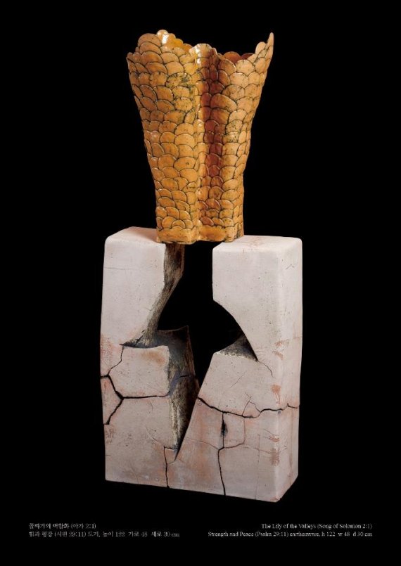 작가는 백합화가 가진 일반적인 속성, 힘과 아름다움, 순수함에 주목해 이번 전시를 구성했다. 대표작은 '힘과 평강(사진)'이다. 이 작품 역시 성경의 시편 29장 11절에 나오는 구절에서 모티브를 얻어 만들었다.