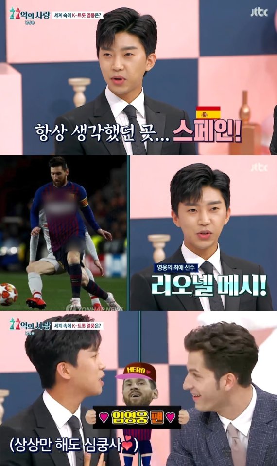 임영웅은 "꼭 스페인에 가서 공연을 해보고 싶다. 이유는 제가 축구를 되게 좋아한다. 리오넬 메시가 스페인 바르셀로나에서 활동하고 있지 않냐. 그래서 항상 메시를 보러 가고 싶다고 생각해 왔다"고 대답해 눈길을 모았다.