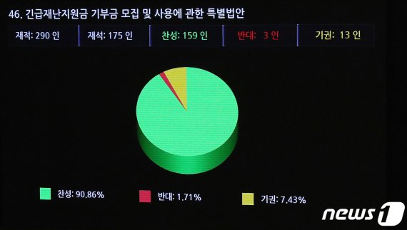 이날 밤 열린 국회 본회의에서 '긴급재난지원금 기부금 모집 및 사용에 관한 특별법'은 재석 175명 중 찬성 159명, 반대 3명, 기권 13명으로 가결됐다.