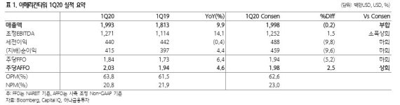 매출액은 컨센서스에 부합하고 조정EBITDA와 주당AFFO는 컨센서스를 소폭상회하는 양호한 실적이다.