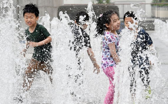 서울 낮 최고기운이 27도까지 상승하며 초여름 날씨를 보인 3일 오후 서울 광화문광장 분수대에서 부모와 함께 나들이 온 어린이들이 물놀이를 즐기고 있다.