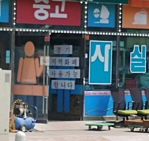 이 곳에서 약 200m 떨어진 사무용품점도 비슷한 이유에서 '지역화폐 가능'이라는 현수막을 출입문에 내 걸었다.