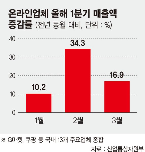 산업통상자원부에 따르면 G마켓, 쿠팡 등 13개 주요 온라인 유통업체의 전년 동월 대비 매출액 증감률은 지난 1월 10.2%에서 2월 34.3%, 3월 16.9%로 급증했다.