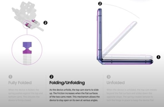 하이드어웨이 힌지(Hideaway Hinge)는 듀얼 CAM 메커니즘(dual CAM mechanism) 덕분에 갤럭시 Z 플립의 차원이 다른 폴딩 경험을 구현하게 되었다.